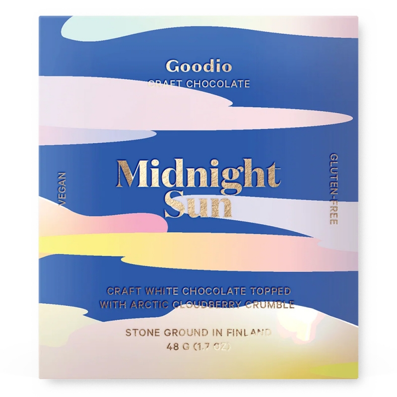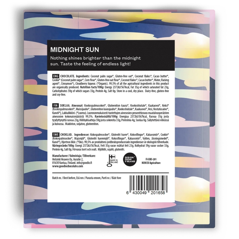 Finská bílá bio čokoláda Midnight Sun z exkluzivní kolekce Arctic elements vás přenese za polární kruh, kde slunce v létě nezapadá a i o půlnoci září nízko nad obzorem. Vyladěná bílá bean-to-bar čokoláda z přírodních surovin je posypaná bio bezlepkovou sušenkou s likérem z ručně sbíraných arktických morušek podle 170 let starého receptu finské likérky Lignell & Piispanen.z