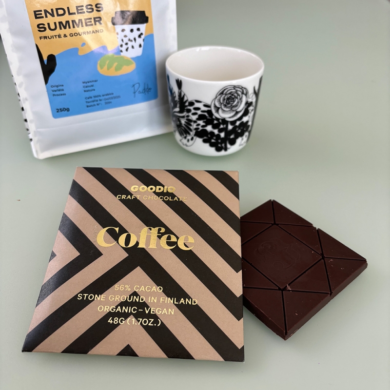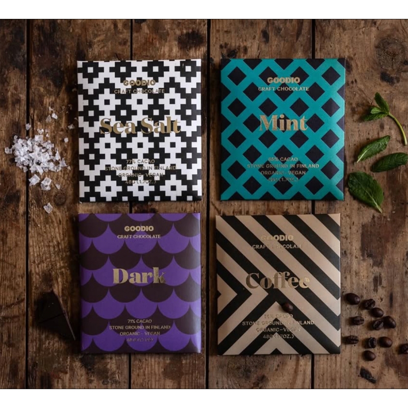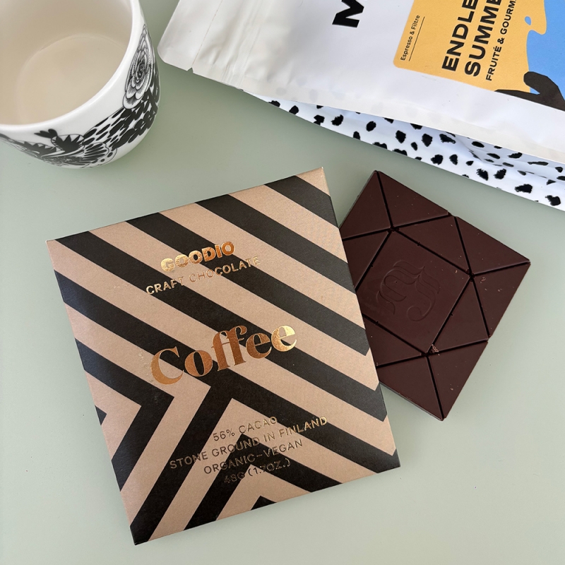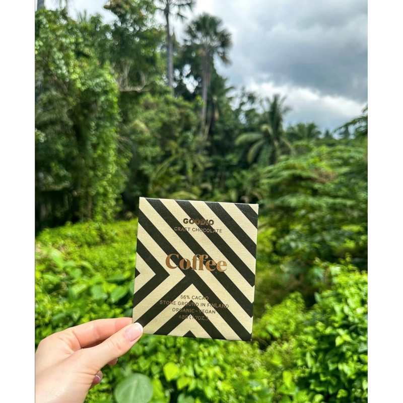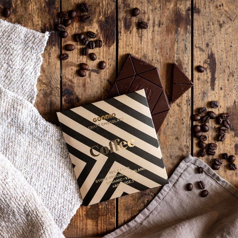 Finská čokoládovna Goodio používá ty nejlepší bio kakaové boby z pečlivě vybraných farem v Peru, Ekvádoru a Kongu. Boby se po tři dny melou na kamenných mlýnech a čokoláda tak dostává sametovou konzistenci a lahodnou chuť, kterou doplňuje chuť kávy. Vše dovádí k dokonalosti krásné designové balení, které čokoládu předurčuje k podarování.