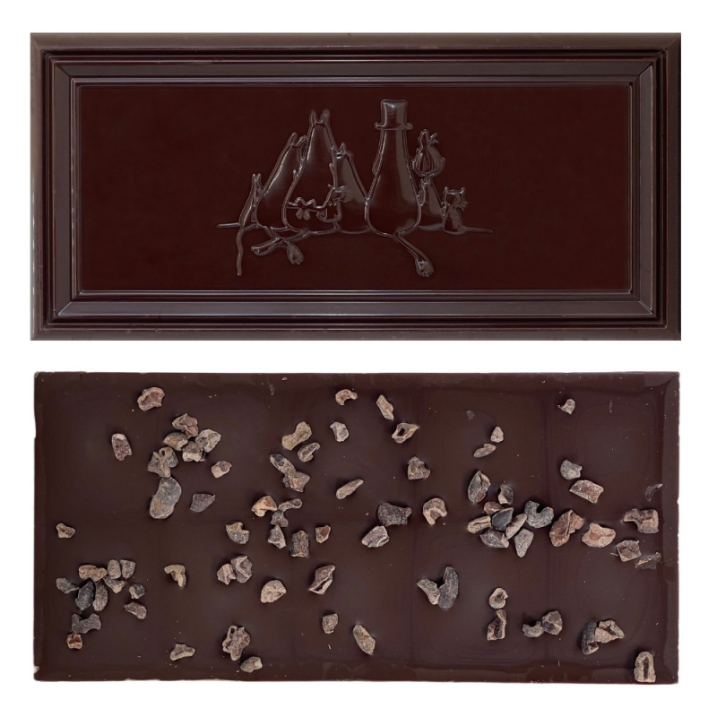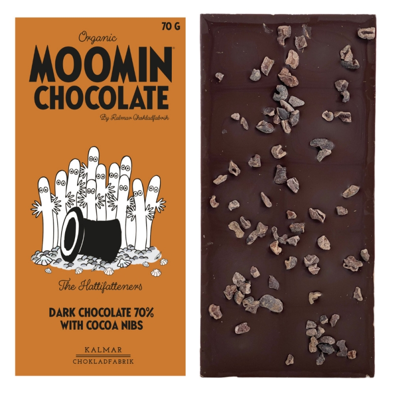 Švédská bio čokoláda z rodinné čokoládovny Kalmar Chokladfabrik spojuje bohatou a intenzivní chuť kvalitní 70% čokolády s jemně křupavými kakaovými nibsy. Inspirována tajemnými Hattifatteners z příběhů Tove Jansson přináší harmonii plné čokoládové chuti a textury kakaových nibsů.