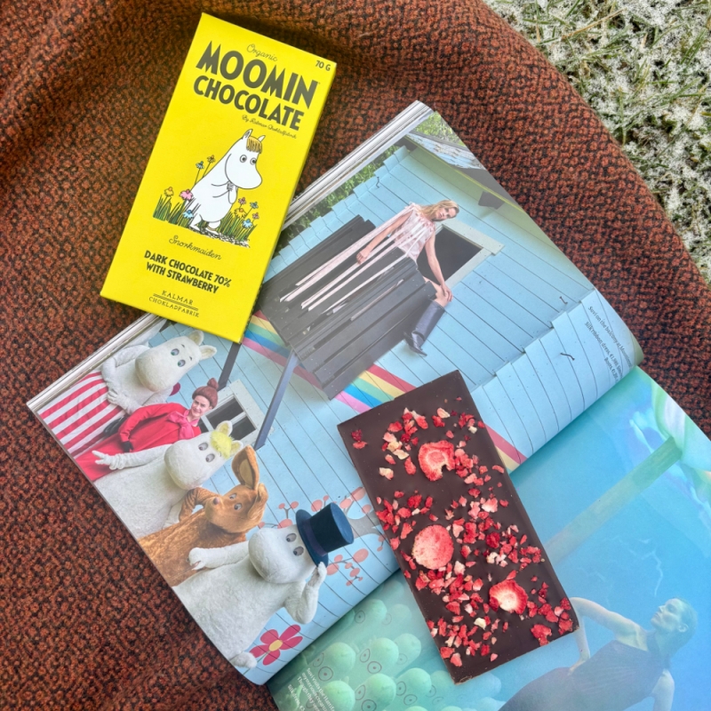 Švédská bio čokoláda z rodinné čokoládovny Kalmar Chokladfabrik spojuje jemnou, plnou chuť kvalitní 70% čokolády s ovocnou svěžestí sušených jahod. Inspirována okouzlující a optimistickou slečnou Ferkou z příběhů Tove Jansson přináší harmonické spojení hořké čokolády a sladkých tónů letního ovoce.