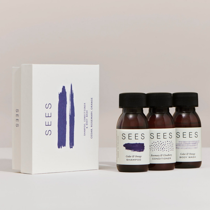 Cestovní set prémiové finské kosmetiky SEES v krásném designovém balení obsahuje to nejlepší, co si můžete na cestách dopřát. Biologicky odbouratelný šampon, kondicionér a sprchový gel s esenciálními oleji z cedru, kůry sladkého pomeranče, rozmarýnu a vřesu nádherně voní, čistí a vyživují pokožku a vlasy. I po únavné dlouhé cestě se tak budete cítit svěží. Set je také krásným dárkem na uvítání pro výjimečné hosty, aby byl jejich zážitek z pobytu dokonalý.