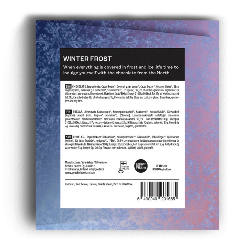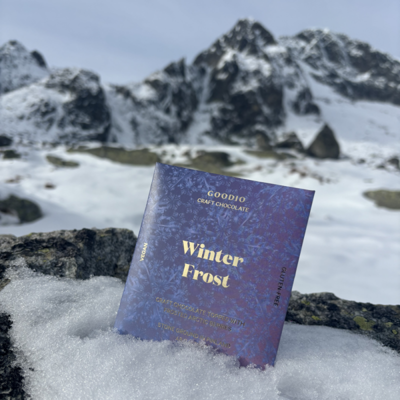 Finská čokoláda Winter Frost vás přenese do tichého zimního lesa, kde se mrazem pokryté bobule třpytí v ranním světle. Jemná bean-to-bar čokoláda se v ní snoubí s březovým cukrem a mrazem políbenými severskými plody, které jí dodávají osvěžující ovocný tón.