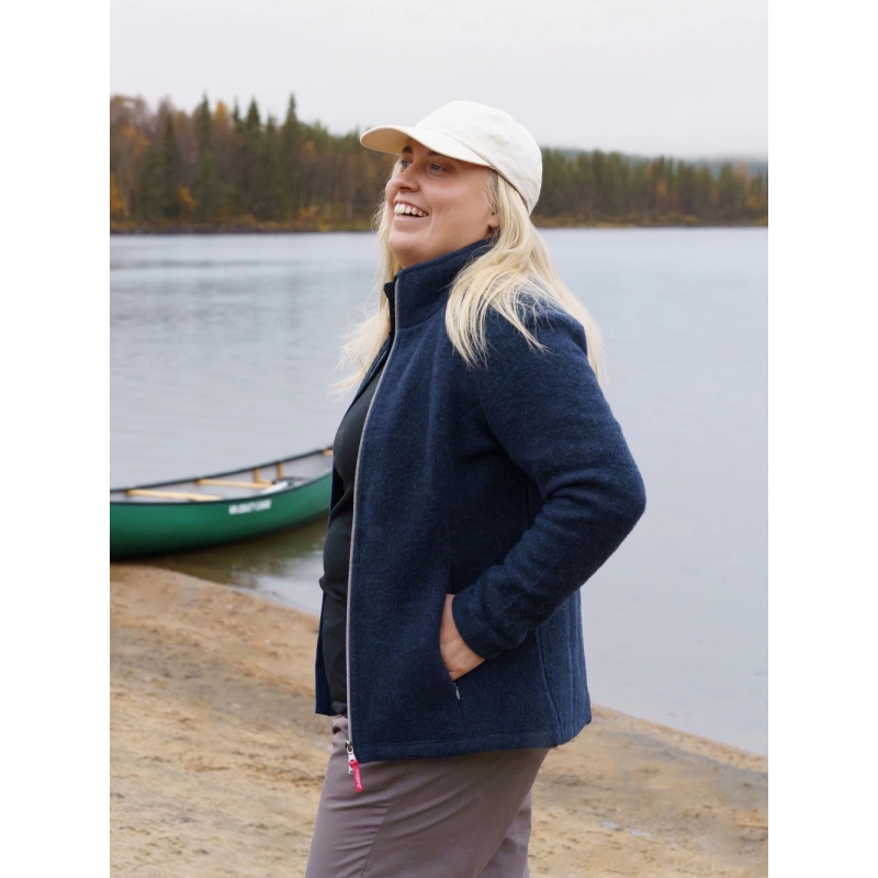 Dámský střih s oboustranným zipem, dvěma praktickými kapsami na zip a dvěma vnitřními kapsami z jemného bio bavlněného úpletu zaručuje pohodlí i funkčnost. Fleece z čisté vlny neobsahuje žádná syntetická vlákna, a tedy ani mikroplasty, a přirozeně odolává ohni. Vlna navíc neutralizuje pachy a často jí stačí pouze vyvětrat – praní není nutné po každém nošení.