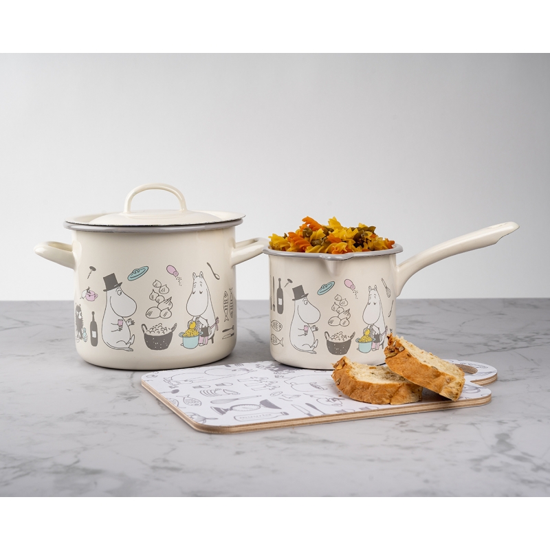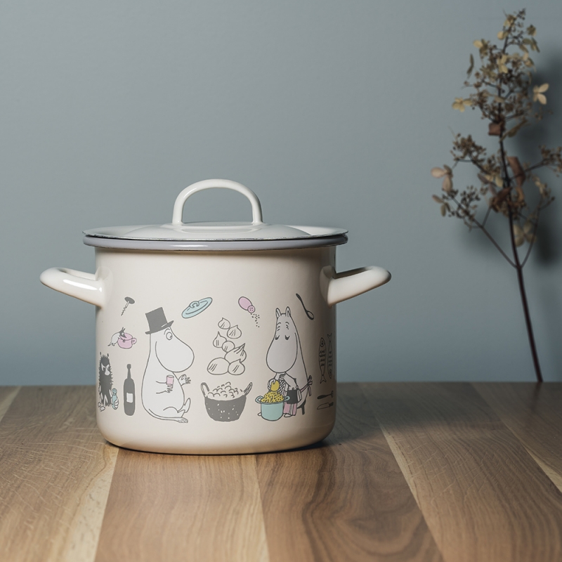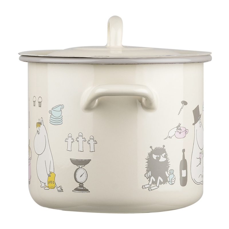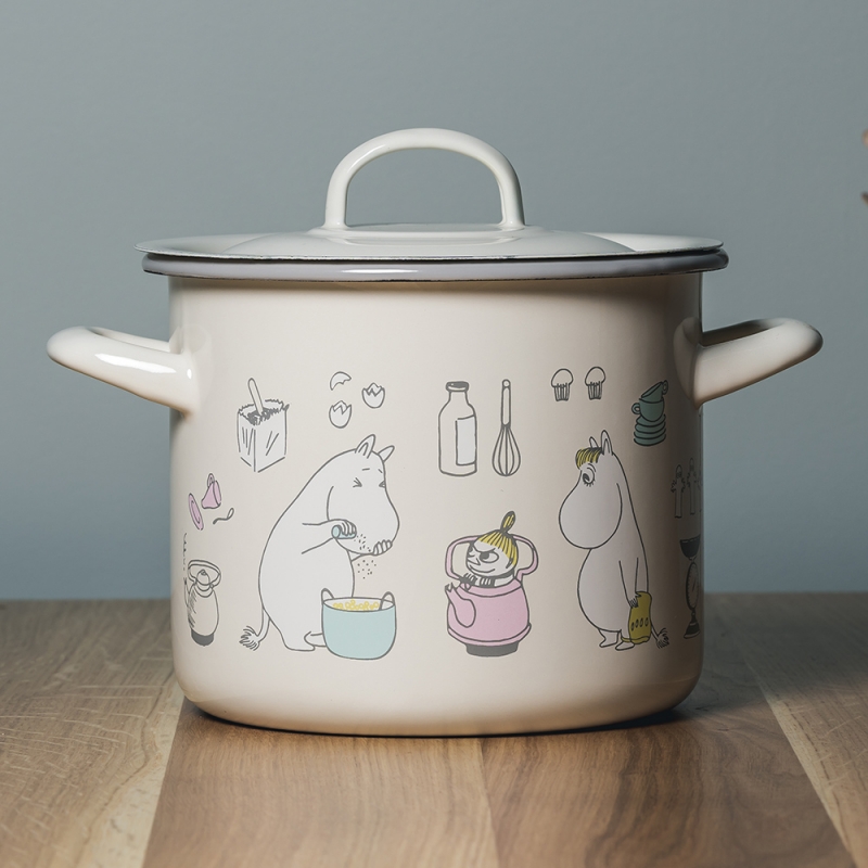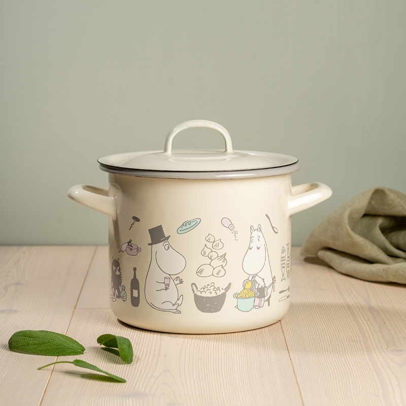 Smaltovaný hrnec s pokličkou s motivem Muminků, kteří právě chystají oběd. Maminka strouhá brambory, tatínek jí dělá společnost, Muminek sype koření a vše sleduje nezbedná Malá Mia a slečna Ferka. Krásný hrnec, ve kterém můžete připravovat všelijaké dobroty.