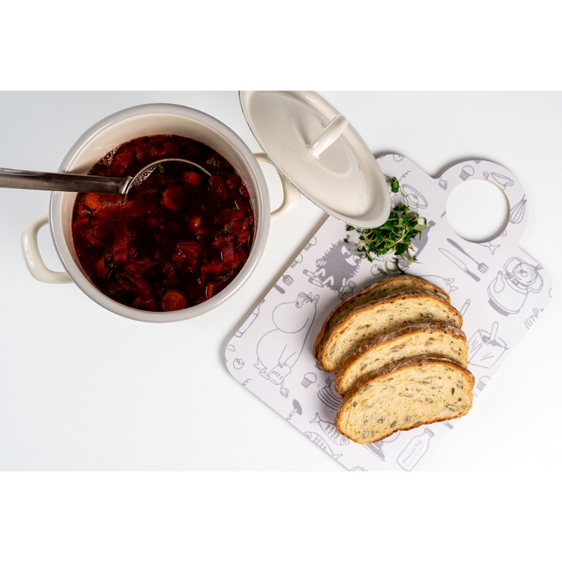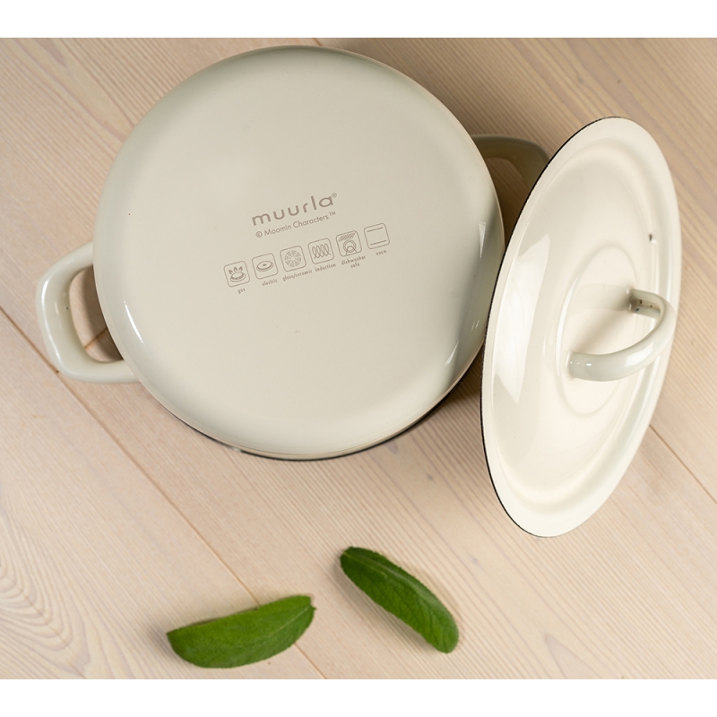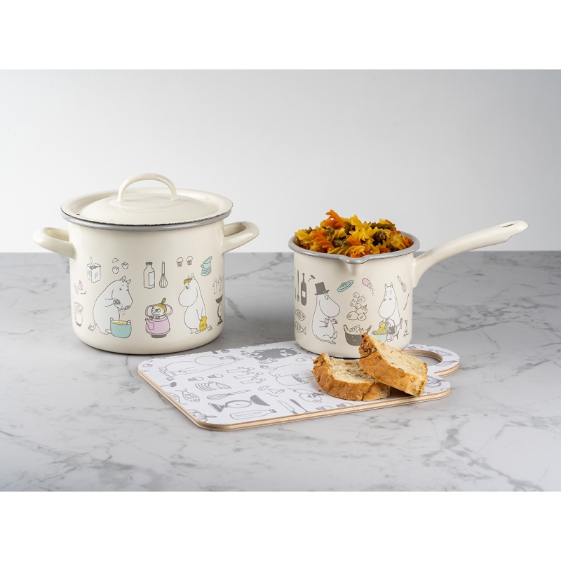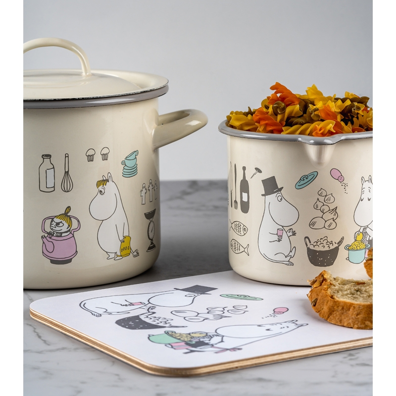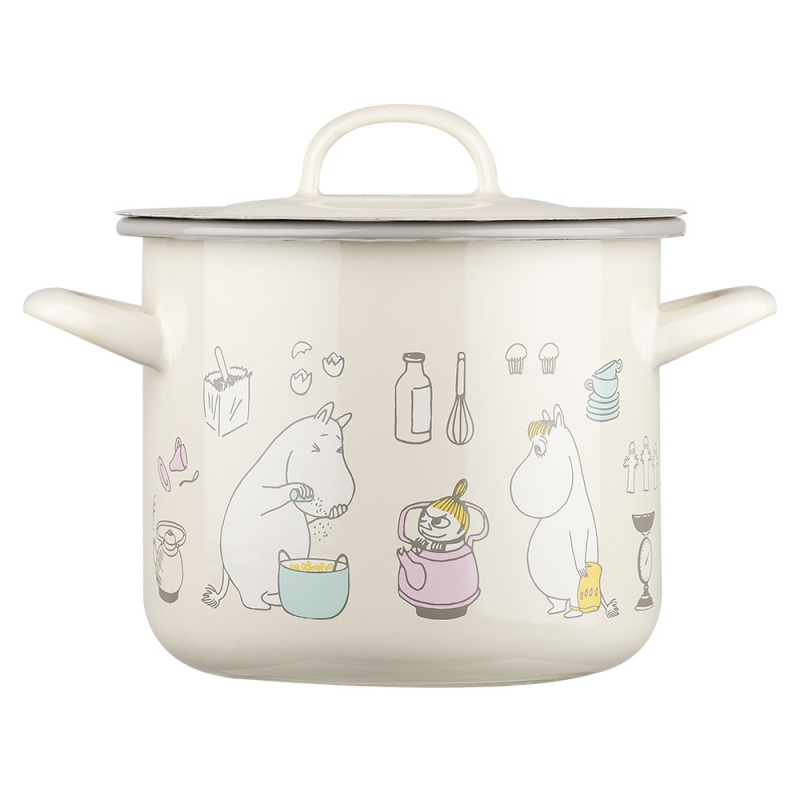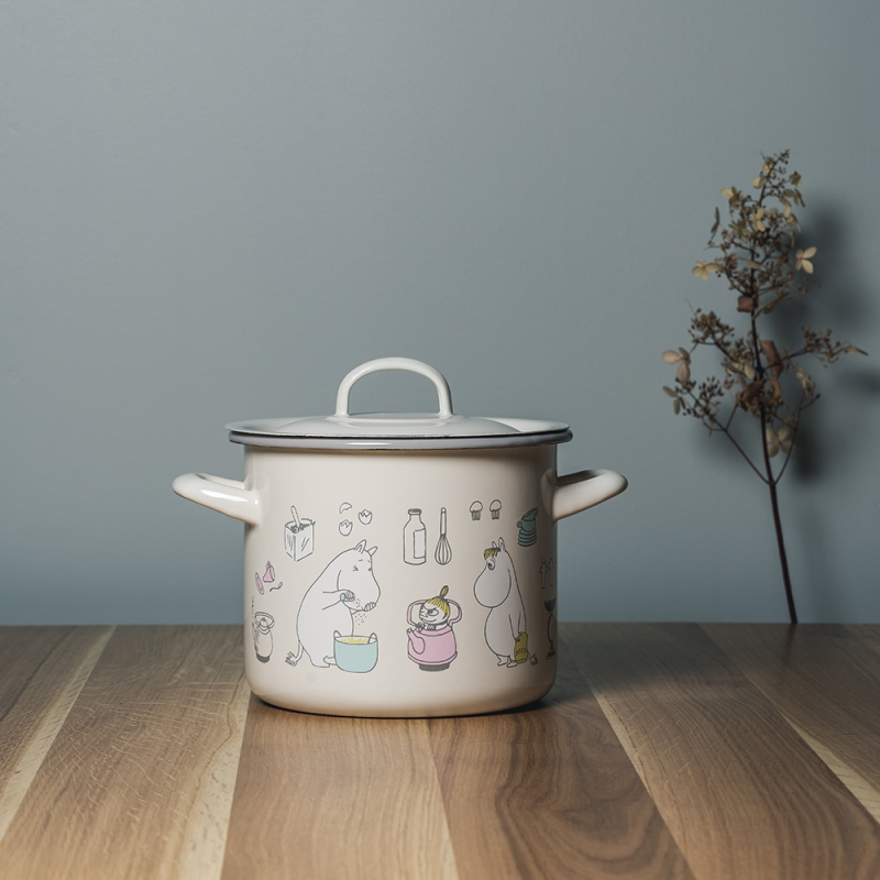 Smaltovaný hrnec s pokličkou s motivem Muminků, kteří právě chystají oběd. Maminka strouhá brambory, tatínek jí dělá společnost, Muminek sype koření a vše sleduje nezbedná Malá Mia a slečna Ferka. Krásný hrnec, ve kterém můžete připravovat všelijaké dobroty.