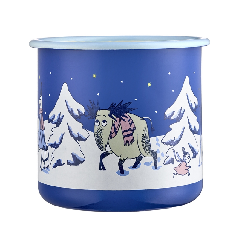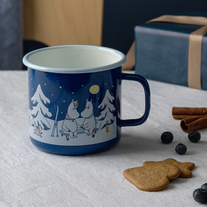 Velký smaltovaný hrnek z kolekce Starry Night zachycuje Muminky při večerním setkání pod zimní hvězdnou oblohou a zářícím úplňkem. Ilustrace inspirovaná příběhy od finské autorky Tove Jansson potěší všechny, kdo milují kouzlo muminího údolí, přátelství a společné chvíle uprostřed přírody. Hrnek je z limitované zimní kolekce.