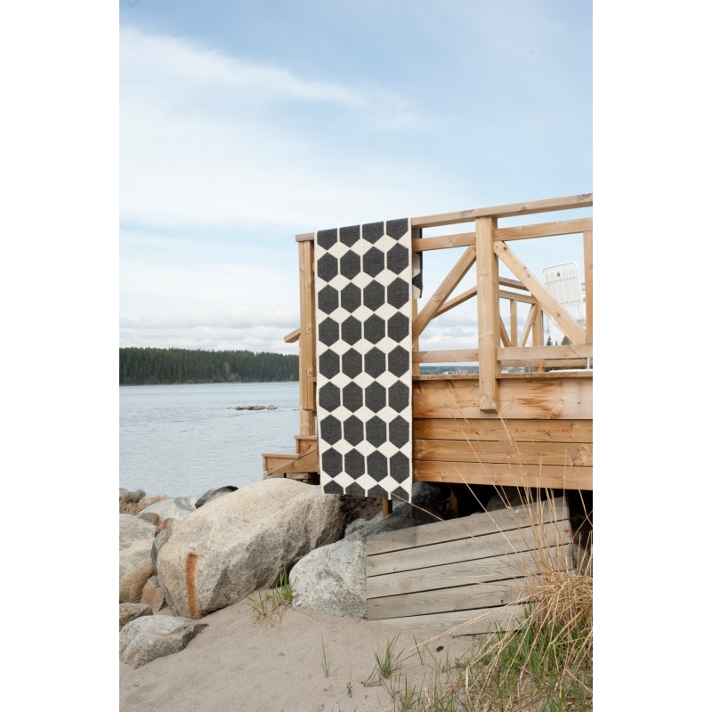 Ručně pletený kusový koberec Anna s pravidelným černým vzorem. Koberec je vhodný i pro náročné prostředí včetně venkovního použití na terase nebo balkoně. Velmi dobře poslouží také v kuchyni nebo v chodbě, kde klasické koberce trpí vlhkostí a častějším znečištěním. Vinylová folie je protiskluzová, odolná, lze ji vyprat a je vhodná pro alergiky.