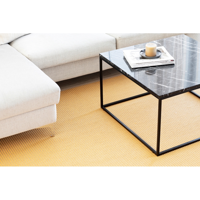 Kusový koberec Lyyra z bavlny a papírového vlákna ve žlutém odstínu s širokým lemem. Bavlna protkná papírovým vláknem je elegantní a příjemná na chodidla. Koberec je tak ideální do ložnice, obývacího pokoje nebo jídelny.