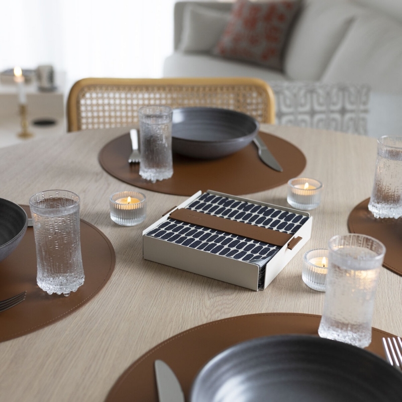Elegantní kulaté prostírání z recyklované kůže dodá vašemu stolu nadčasový vzhled a zároveň jej ochrání před skvrnami a případnými nárazy nádobí a sklenic. Díky svému tvaru se skvěle hodí i na kulaté jídelní stoly, kde podtrhne jejich tvar a styl. Můžete jej použít i samostatně – například jako dekorativní prvek uprostřed stolu pod vázu či svícen.
