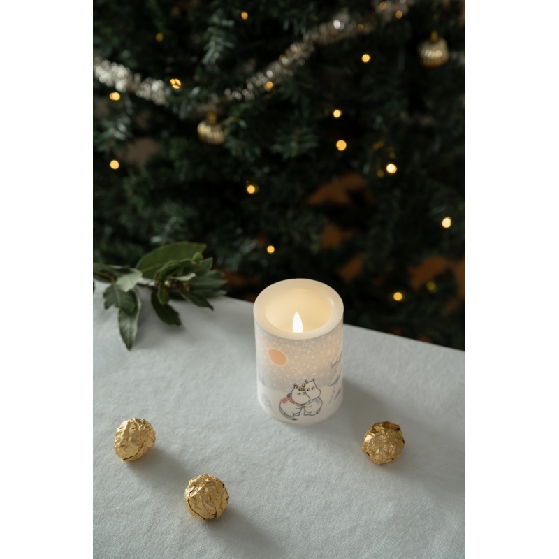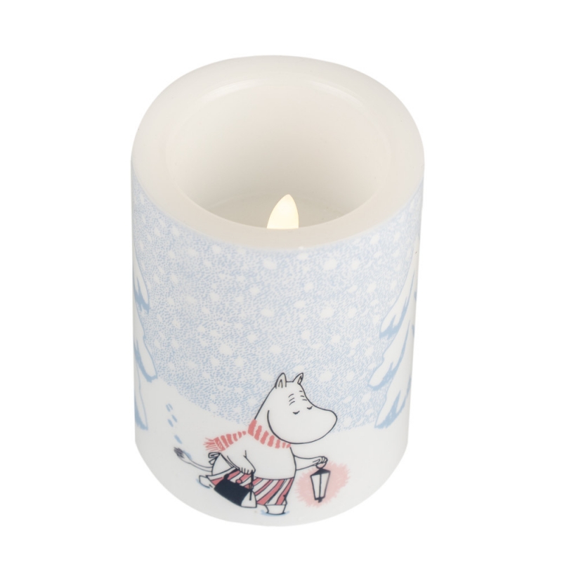Kouzelná LED svíčka nese po obvodu muminkovský motiv Let it snow. Zasněžená, tichá scenérie, kterou po sobě zanechala sněhová bouře, si říká o výrobu sněhových luceren a Muminek se do toho hned pustí. Ať sněží! Svíčka s motivem z příběhů finské spisovatelky Tove Jansson navodí doma hřejivou atmosféru a přinese do interiéru kousek severské zimní pohody.