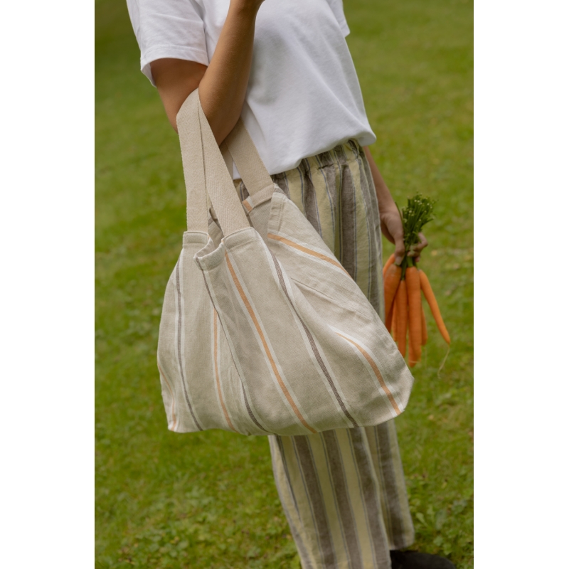 Dvouvrstvá lněná tkanina má z každé strany lehce odlišný vzhled, což dodává tašce živý a zajímavý charakter. Pevná široká ucha tkaná také ze lnu zajišťují dlouhou životnost a pohodlné nošení i při plném zatížení. Taška Tori je praktická, nadčasová a navržená pro bezstarostné letní dny.