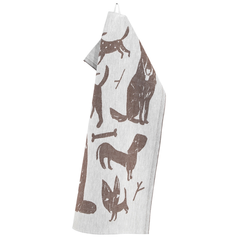 Utěrka Koirapuisto s hravým motivem psů od finského designéra Mattiho Pikkujämsy. Z jedné strany je utěrka tmavá se světlou kresbou, na druhé je naopak světlý podklad a kresba tmavá. Díky svému složení ze směsi lnu a biobavlny utěrka výborně saje a je zároveň příjemná na dotek.