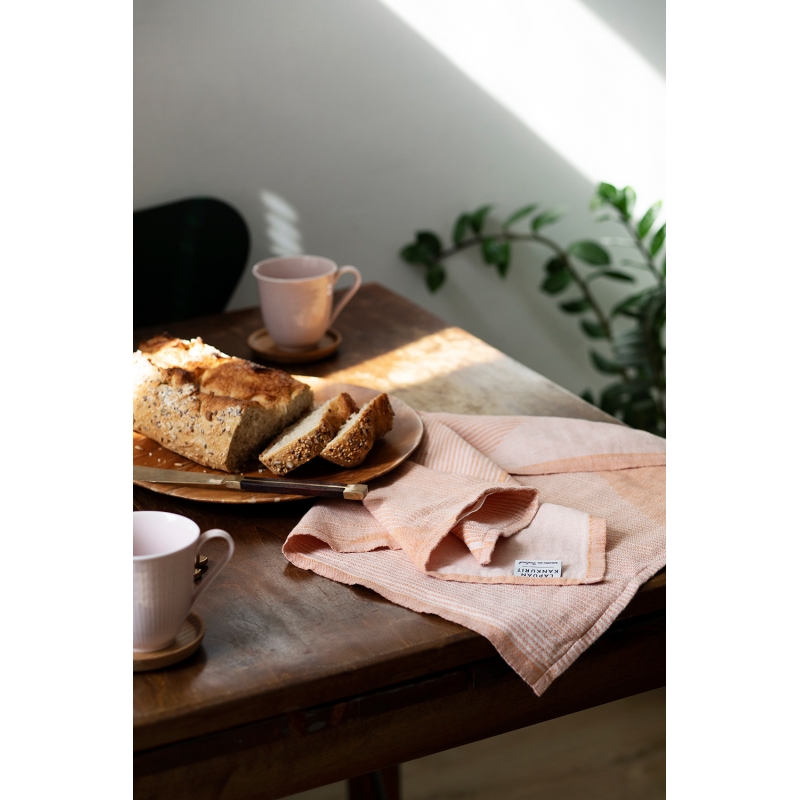 Nádherná kuchyňská utěrka Rinne tkaná ze 100% lnu spojuje eleganci s praktičností. Vzor Riine (finsky svah) ve sladěné kombinaci oranžové a růžové doladí vaši kuchyňskou linku, ať už ji dokonale vyžehlíte nebo ji necháte ležérně pomačkanou. Len rychle schne a je tak praktický na každodenní úkoly v kuchyni.