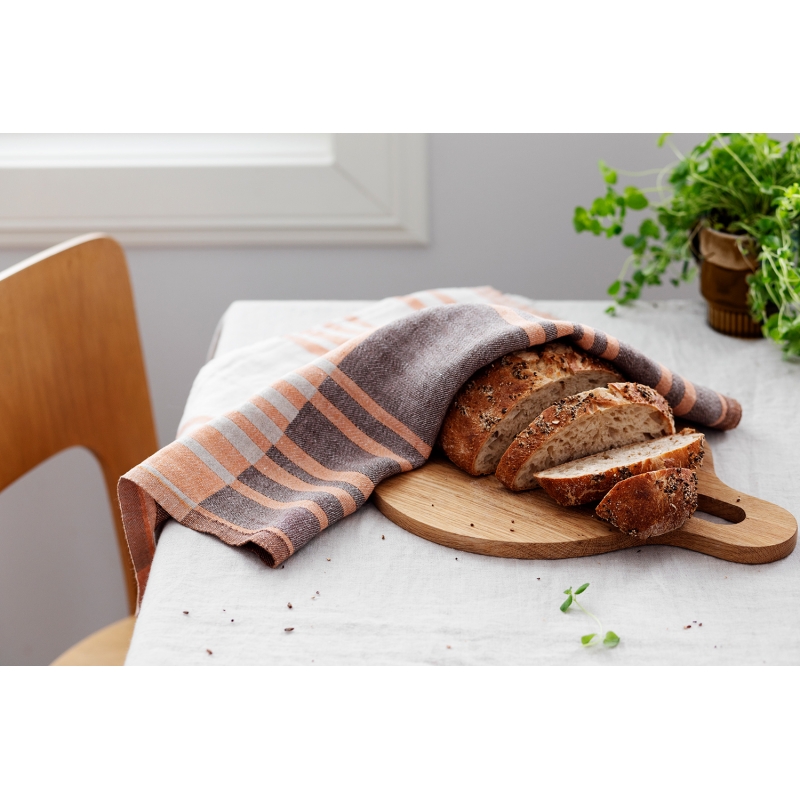 Parádní kuchyňská utěrka Toffee tkaná ze 100% lnu ve sladěné barevné kombinaci oranžové a hnědé doladí vaši kuchyňskou linku, ať už ji dokonale vyžehlíte nebo ji necháte ležérně pomačkanou. Len rychle schne a je tak praktický na každodenní úkoly v kuchyni.