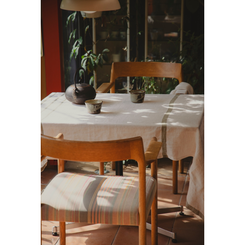 Kvalitní velký ubrus Usva ze 100% lnu v minimalistické kombinaci podkladu v přírodním odstínu lnu a olivově zelených pruhů po stranách.