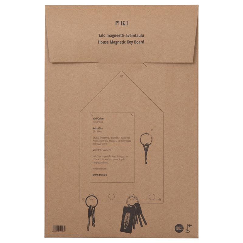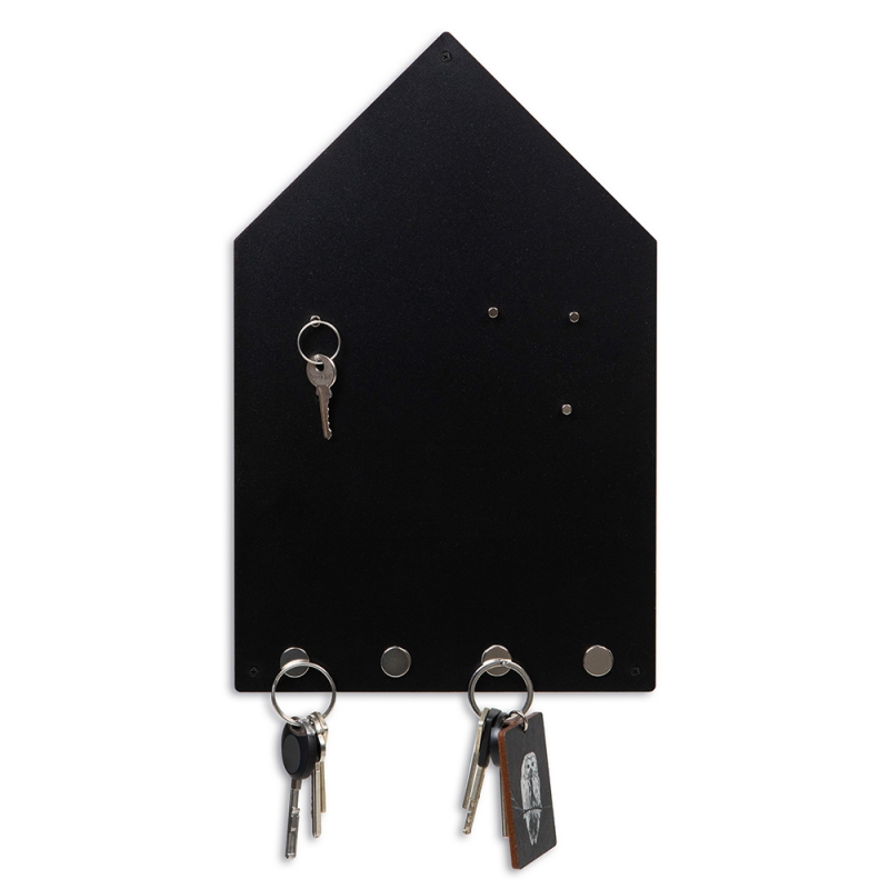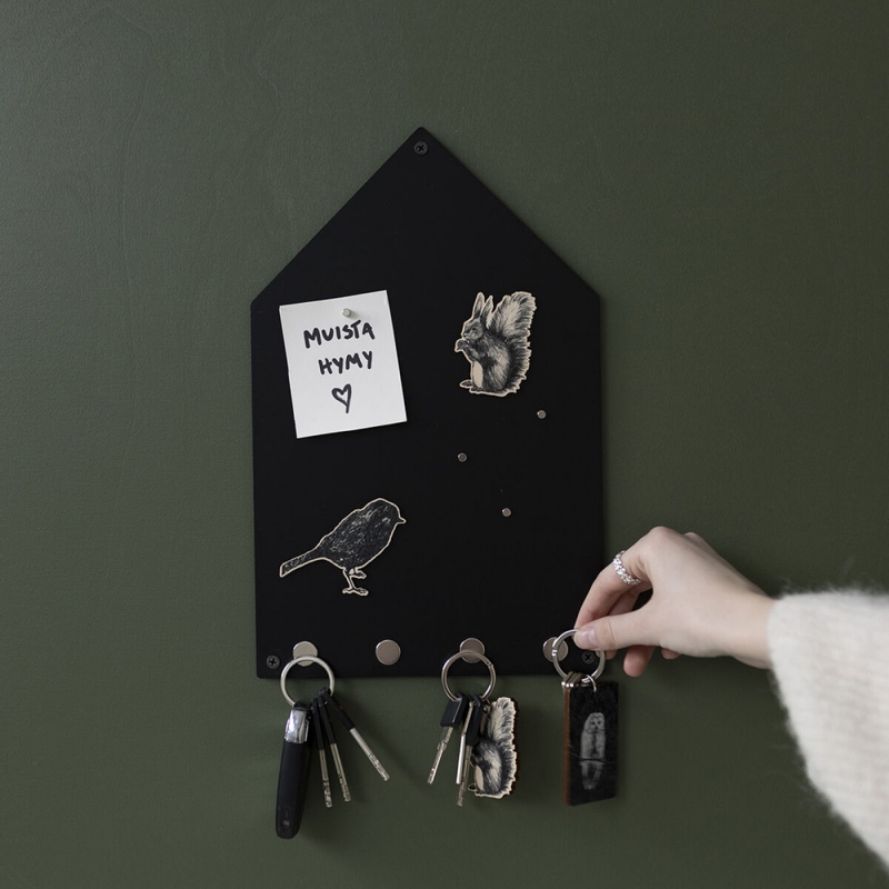 Magnetická tabule má připravené čtyři pevné magnety na odložení klíčů. Další čtyři odnímatelné magnety pak slouží k připnutí připomínek a vzkazů. Tabule ve tvaru domečku má minimalistický design a bude praktickým nadčasovým prvkem v chodbě, předsíni či hale.