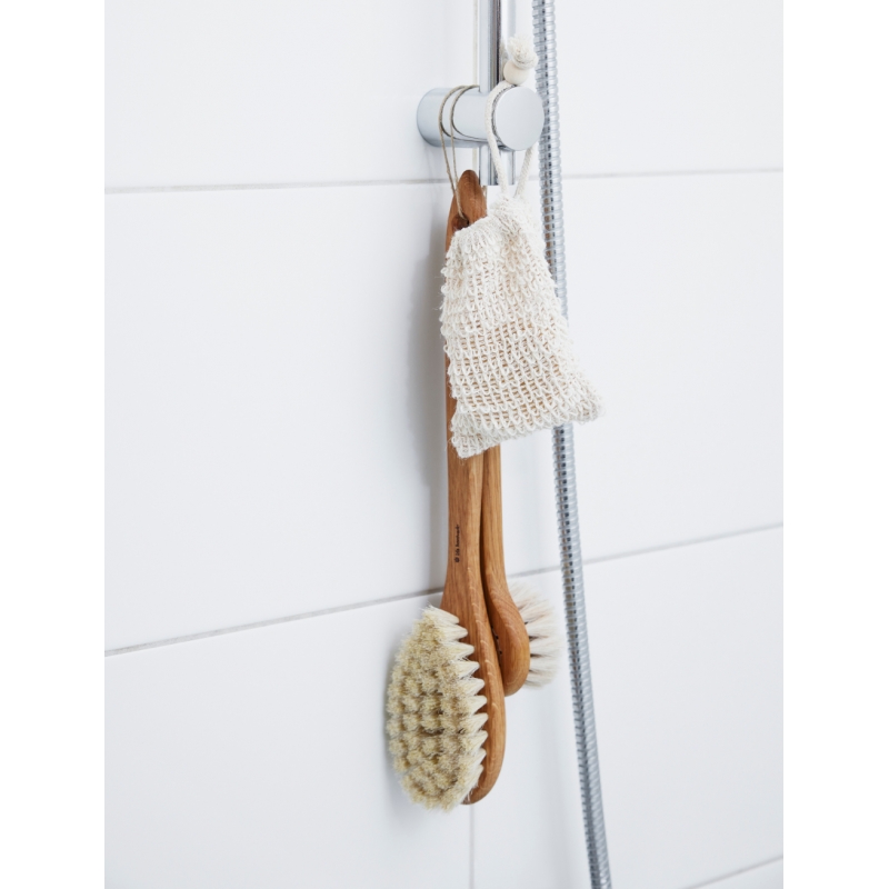 Masážní kartáč krásně uvolní a vyčistí vaši pokožku a díky rukojeti z masivního dubového dřeva dosáhnete i na ta nejméně přístupná místa na zádech. Kartáč je ideální pro masáž při koupeli nebo saunování, kdy dodá vaší relaxaci ještě intenzivnější rozměr. Vlas kartáče je kombinací jemné koňské žíně a rostlinného vlákna tampico, které zajišťuje o něco vyšší peelingový účinek.