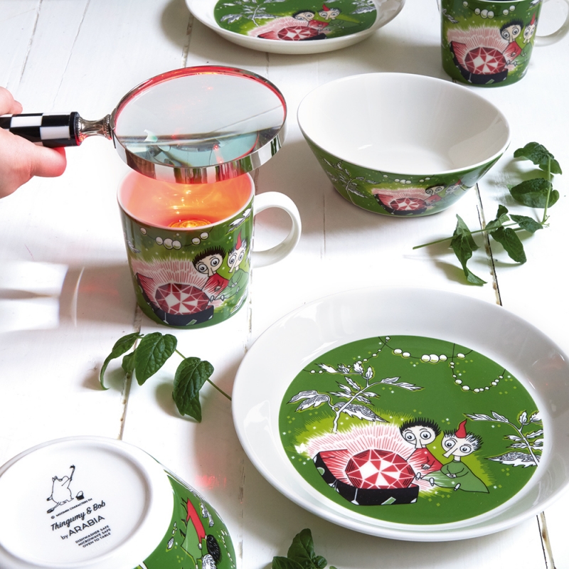Porcelánová miska s postavičkami Thingumy a Boba na motivy příběhu Malí hosté z kouzelného údolí muminků od slavné finské autorky Tove Jansson. Thingumy a Bob skrývají tajemný poklad před chtivým kouzelníkem Hamburinem.