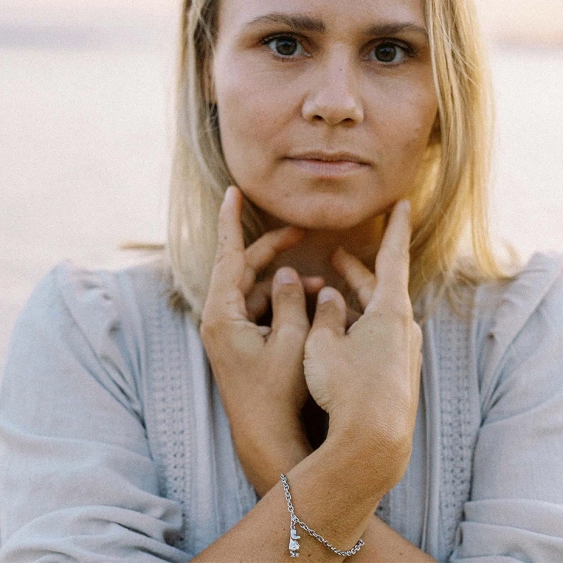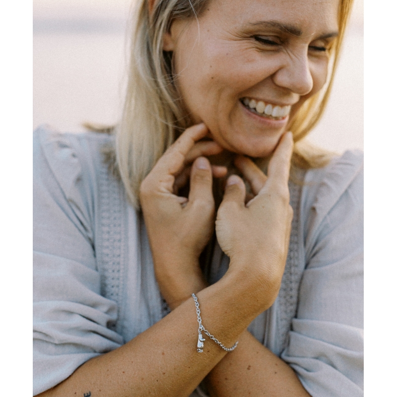 Elegantní, milý stříbrný náramek zdobí jemný přívěsek s postavičkou Mumínka. Minimalistický design náramku kombinuje severskou čistotu s hravým detailem, který potěší všechny fanoušky příběhů Tove Jansson. Vyrábí se s důrazem na ruční zpracování a udržitelnost přímo ve finském Kuopiu v dílnách šperkařského výrobce Lumoava, který se pyšní titulem nejseverněji položeného šperkařství na světe. Nastavitelná délka zajišťuje pohodlné nošení a univerzální velikost. Náramek je dodáván v elegantní dárkové krabičce – připravený potěšit vás nebo vaše blízké.