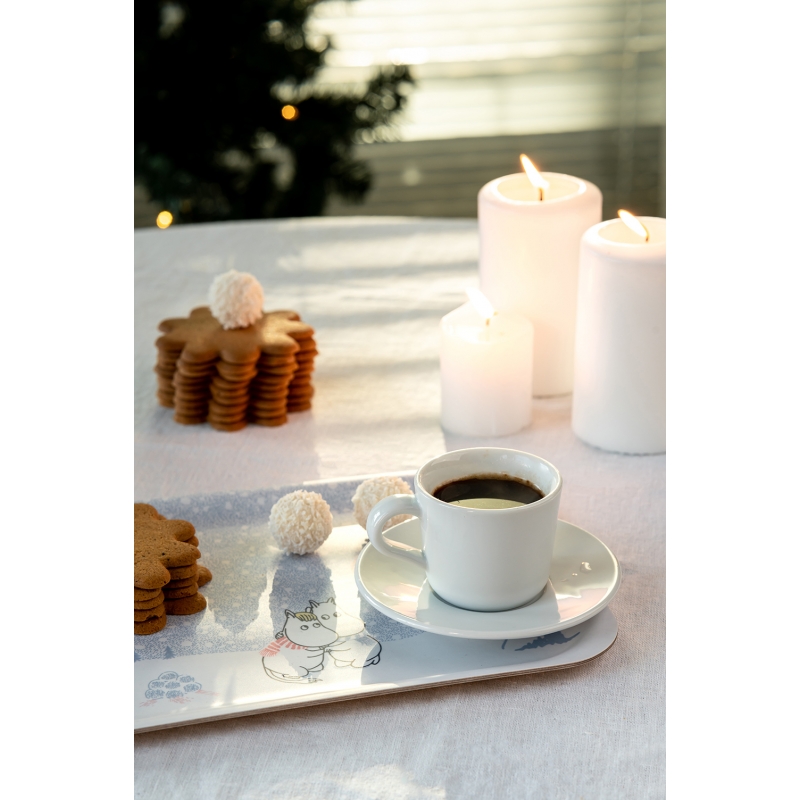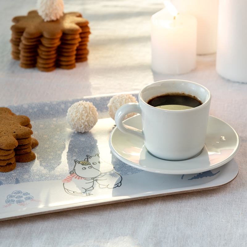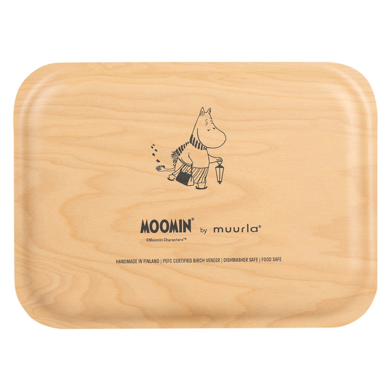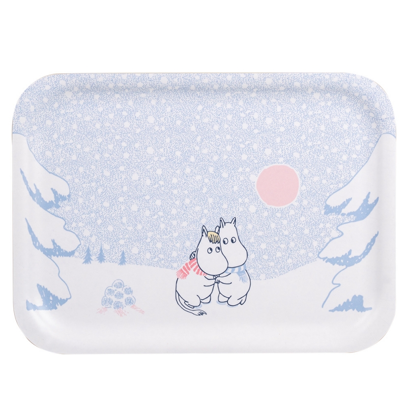 Krásný podnos pro všechny milovníky muminků z pohádek finské spisovatelky Tove Jansson přinese do servírování dobrot radost a hravost. Zasněžená, tichá scenérie, kterou po sobě zanechala sněhová bouře, si říká o výrobu sněhových luceren a Muminek se do toho hned pustí. Díky své praktické velikosti lze tento tác použít k servírování koláčů či dezertů spolu s šálkem kávy nebo čaje. Podnosy se vyrábí přímo ve Finsku a z finské březové překližky.