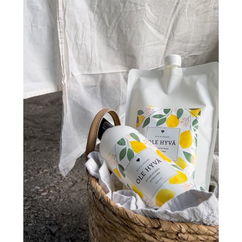 Prostředek je vyrobený ve Finsku s využitím obnovitelných zdrojů a bez zbytečného zatížení životního prostředí značkou Ole Hyvä, která se zaměřuje na ekologicky šetrnou kosmetiku a čisticí prostředky na rostlinné bázi.