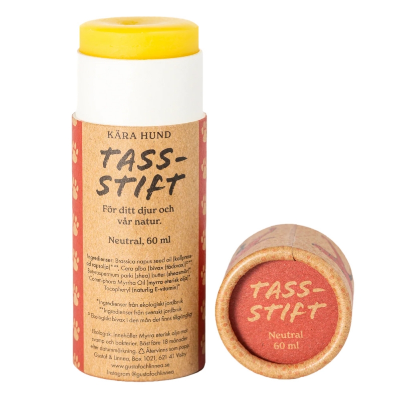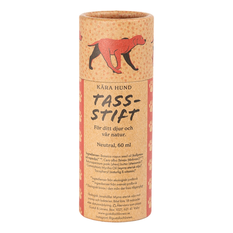 Ekologické balení je vyrobené z odolné papírové tuby. Balzám se snadno nanáší přímo na tlapky – bez zbytečného roztírání a mastných rukou. Balzámy se vyrábí na panensky čistém ostrově Gotland, kde mladý pár Gustaf a Linnea obstarává vlastní včelstva.