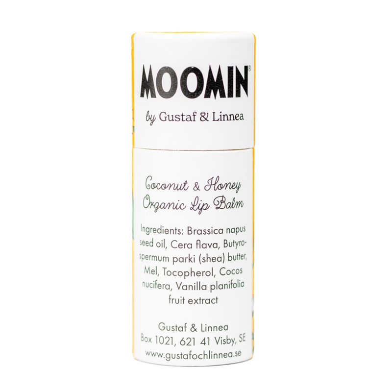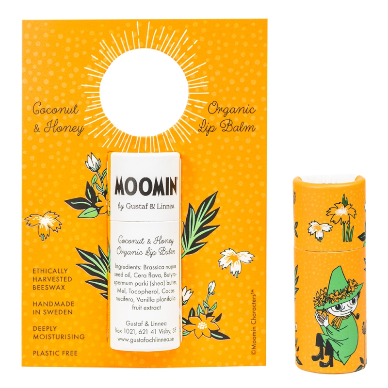 Přírodní balzám na rty s motivem Šňupálka z oblíbených pohádek o Mumincích je vyrobený ve švédské manufaktuře Gustaf och Linnea a spojuje jemnou péči o pokožku s udržitelným přístupem k přírodě.