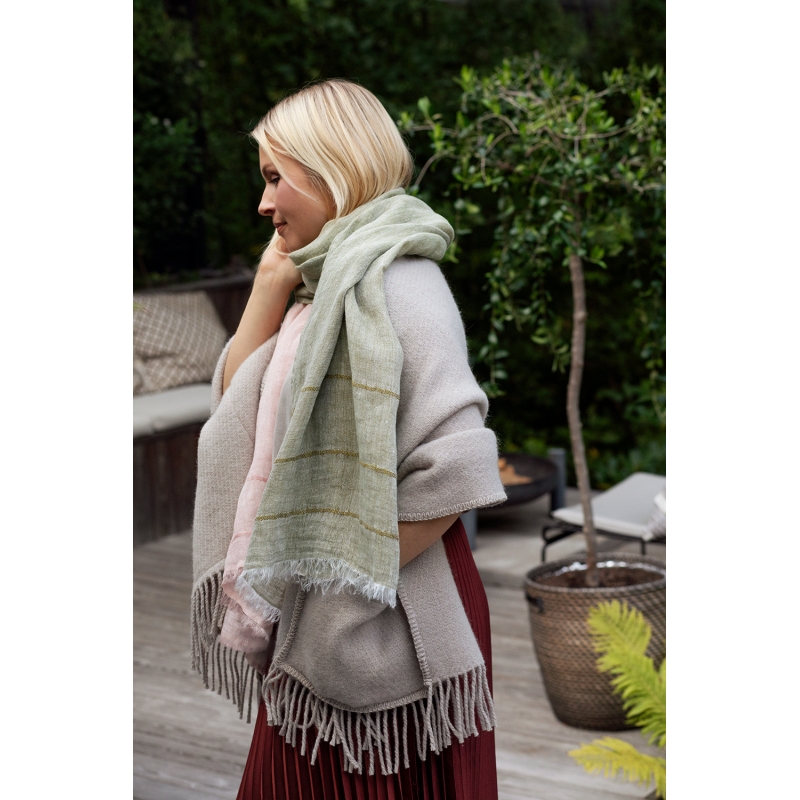 Vlněný šál Uni je utkaný ze 100% čisté střižní vlny, která vás zahřeje vždy, když bude potřeba. Jemný béžový odstín je elegantní a šál dovádí k dokonalosti jemné třásně. Praktické kapsy navíc přináší možnost si do nich uschovat potřebné drobnosti a také zahřát ruce.