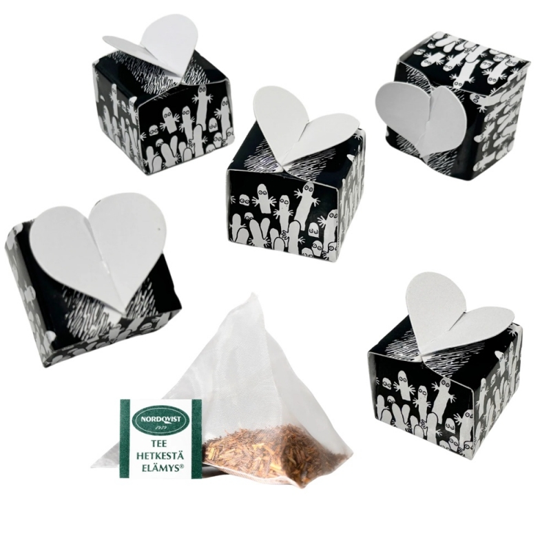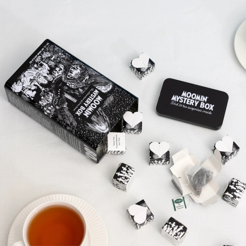 Oslavte 80. výročí Muminků s Moomin Mystery Box od finského výrobce Nordqvist. Stylová plechová dóza zdobená ilustracemi příběhů Tove Jansson zobrazuje Muminky při veselém večírku i dobrodružství na moři. Uvnitř najdete 24 malých srdíčkových balíčků s Hattifatteners, každý s lahodnou čajovou směsí a k tomu sběratelskou kartičku. Počet čajů je ideální pro užívání během Adventu.