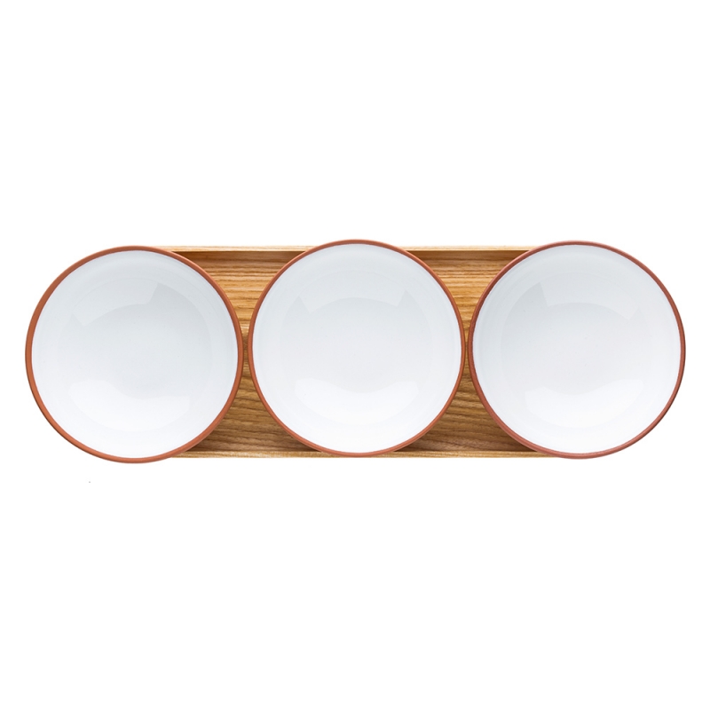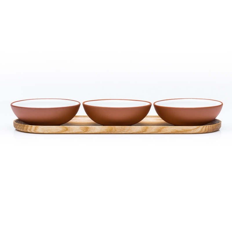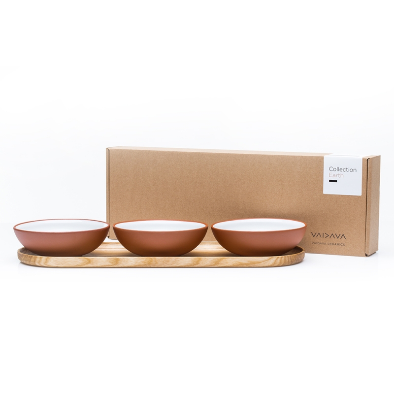 Set tří keramických misek s tácem z jasanového dřeva z kolekce Earth je ideální na servírování oříšků, sladkostí a dalších dobrot. Kolekce z lotyšské manufaktury Vaidava ctí jednoduchost severského minimalismu a klade velký důraz na materiál a detaily. V hlavní roli je kvalitní lotyšská červená hlína, která je z vnější strany jen vyrovnaná a vyleštěná aby neabsorbovala vodu a nečistoty, ale jinak je ponechána surová bez glazury. Doporučujeme set kombinovat s dalším nádobím ze stejné kolekce.