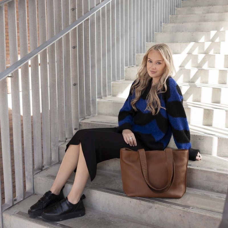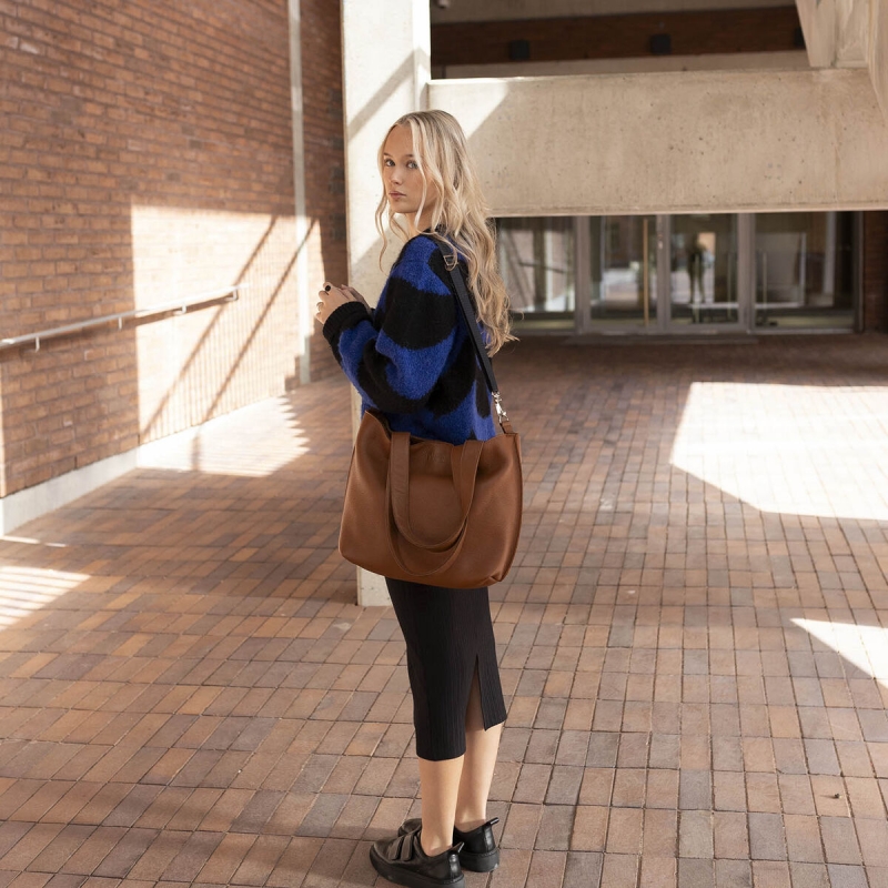 Velká elegantní taška Kajo z prémiové finské losí kůže je ideální volbou pro práci i volný čas. Nabízí dostatek prostoru pro notebook do velikosti 14", důležité dokumenty rozměru A4 a další nezbytnosti. Vnitřní část je vybavena odolnou textilní podšívkou a praktickou kapsou na zip, která udrží vaše věci bezpečně na svém místě. Zipy značky YKK garantují spolehlivost při každodenním používání. Měkká držadla zajišťují pohodlné nošení v ruce nebo na rameni, zatímco nastavitelný a odnímatelný popruh umožňuje nosit tašku také přes tělo.