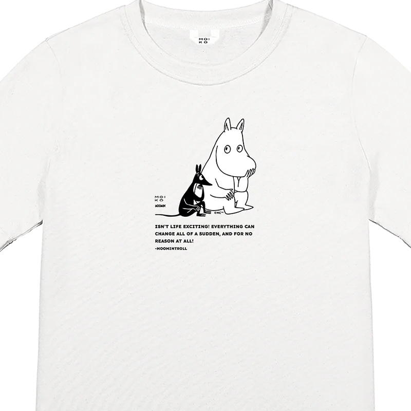 „Není život vzrušující? Všechno se může najednou změnit - a úplně bez důvodu!“ Taky to tak občas máte? Mumínek je ztracený ve svých hlubokých úvahách a vy se k němu můžete přidat s tímto jemně filozofickým tričkem, které pobaví i donutí k zamyšlení.