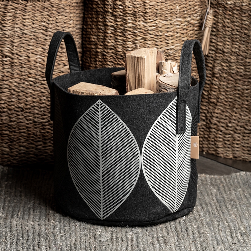 Plstěný multifunkční úložný koš s motivem listů na černém podkladu. Plstěný materiál je lehký a přitom odolný při používání. Úložný koš nabízí nekonečné možnosti využití. Můžete do něj schovat hračky, časopisy, polštáře nebo přikrývky a také může stejně dobře posloužit na nošení dříví ke krbu.