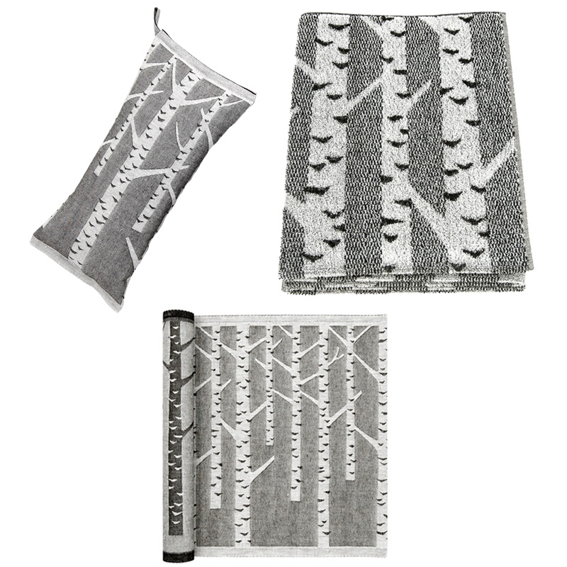 Odpočiňte si v sauně na podložce a polštáři se vzorem březových kmenů a po saunování se nechte hýčkat luxusní osuškou. Zasněžený březový les v neutrální černobílé barvě vás zavede daleko od všedního světa.