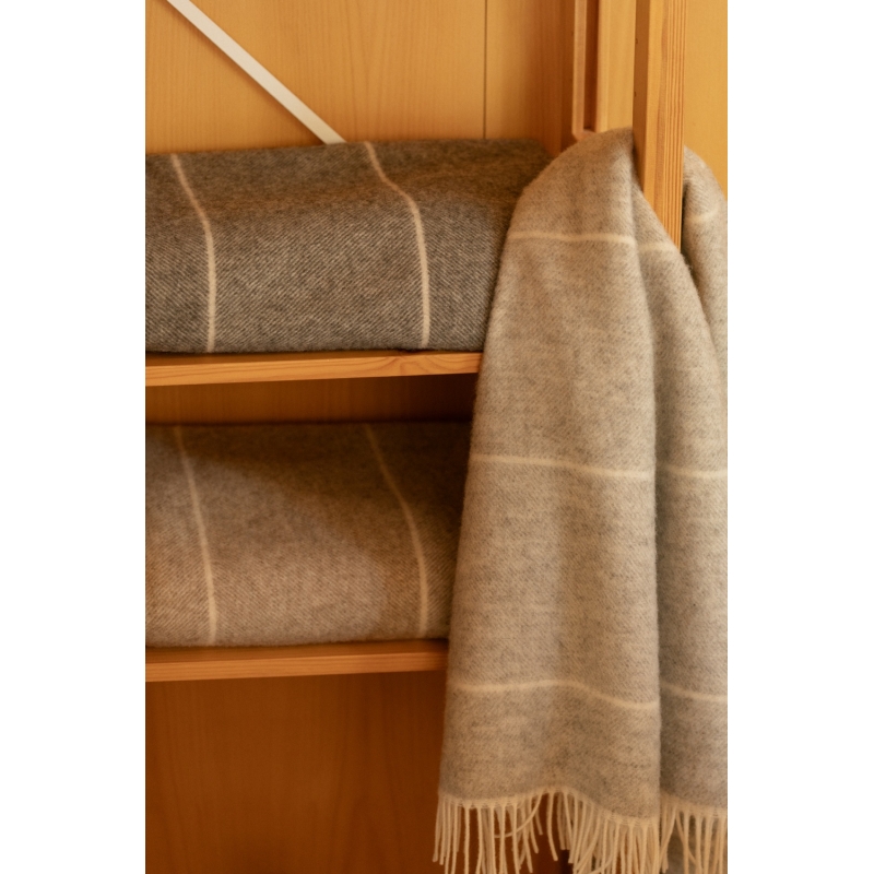 Vlněná deka Aika je utkaná ve Finsku z prvotřídní finské ovčí vlny Finnsheep v kombinaci s certifikovanou novozélandskou vlnou. Přírodní béžový odstín s jemnými linkami dolaďují po stranách elegantní třásně.