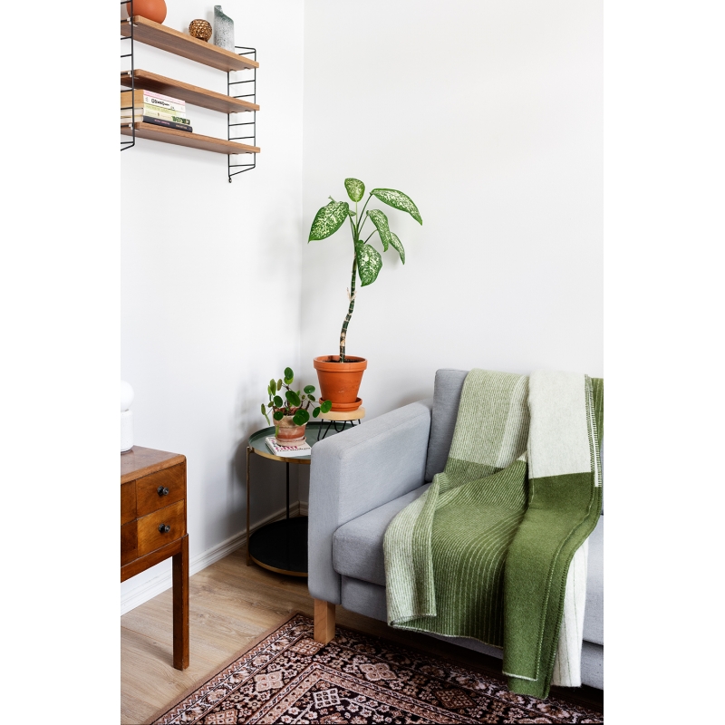 Velká vlněná deka Kaamos (finsky polární noc) je utkaná ve Finsku z prvotřídní finské ovčí vlny Finnsheep v kombinaci s certifikovanou novozélandskou vlnou. Designérka Hanna Galtat se inspirovala každodenním cyklem světla a tmy. Příjemný olivový odstín dodá interiéru klidnou a útulnou atmosféru.
