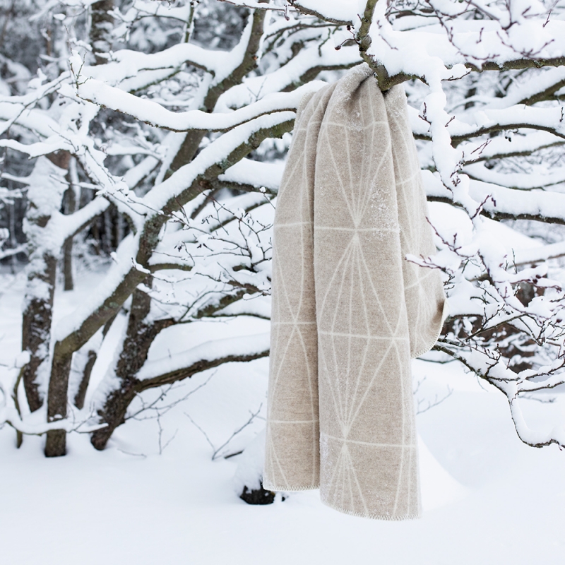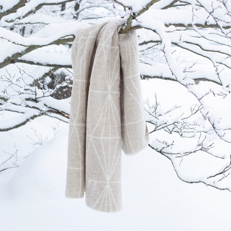 Kvalitní velká deka Kehrä ze 100% čisté střižní vlny se geometrickým vzorem.