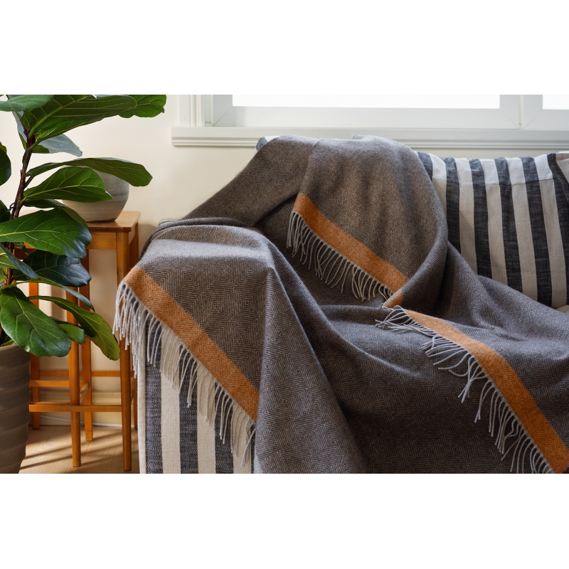 Kvalitní deka Rauha je tkaná ze 100% jemné čisté střižní vlny v klasickém vzoru s  elegantním pruhem a třásněmi po okrajích. Zabalte se do ní na pohovce, použijte ji jako stylový přehoz přes postel nebo si ji vezměte jako přikrývku při posezení na zahradě.
