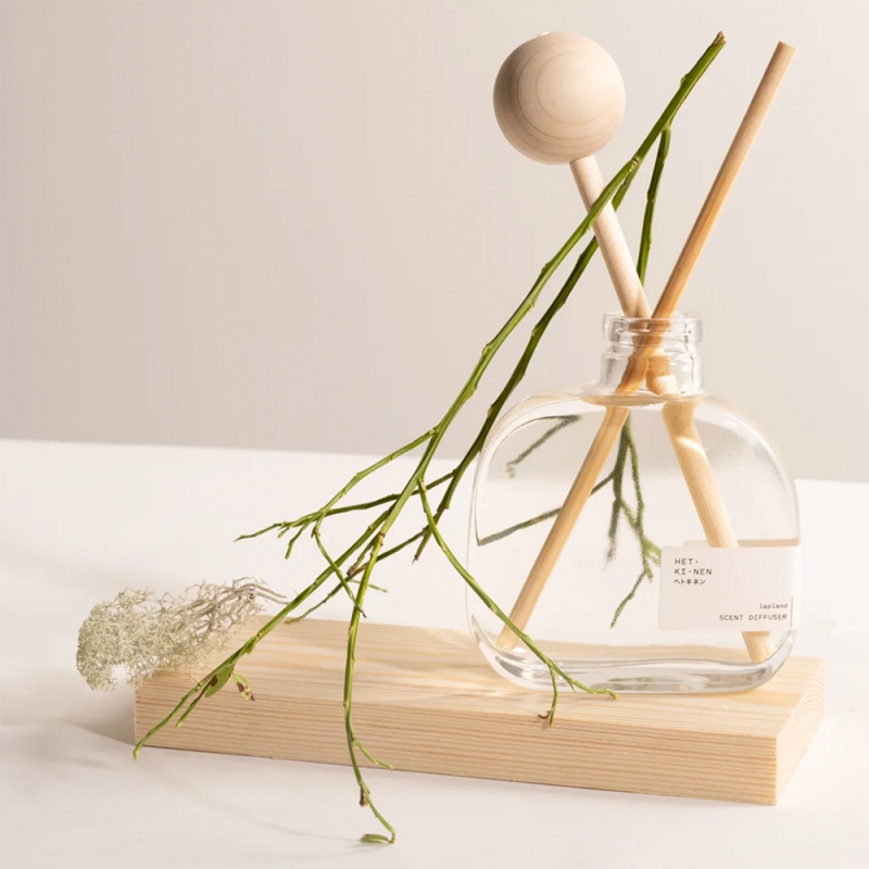 Vůně je uchovaná v elegantní skleněné láhvi s dřevěnou zátkou a k difuzéru jsou přiloženy dvě tyčinky z borovicového dřeva.