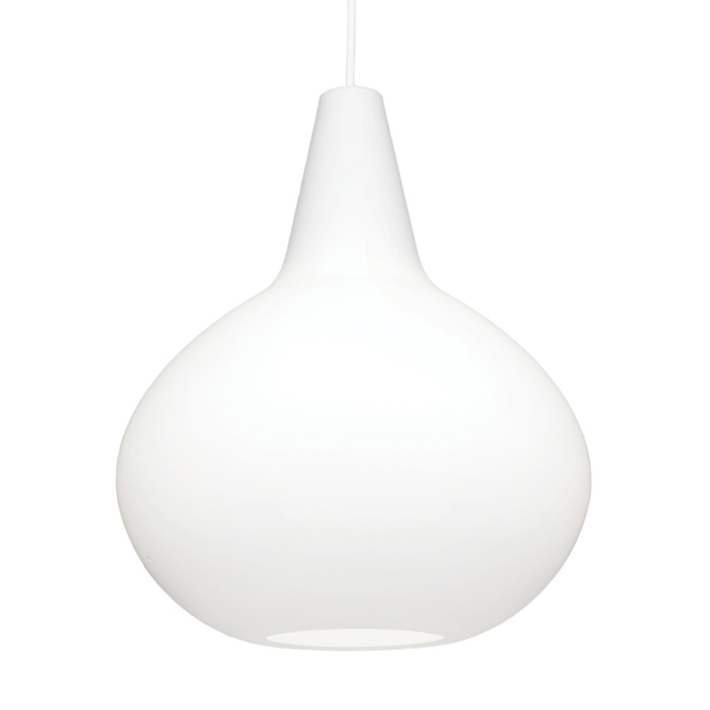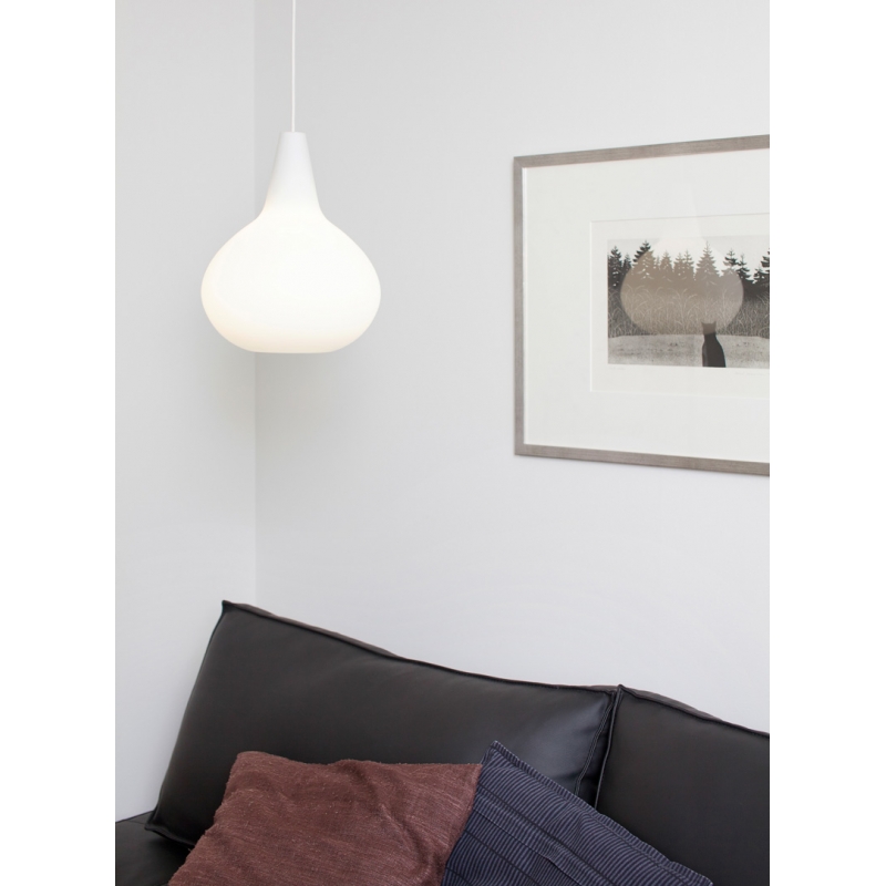 Závěsná lampa Bulbo z ručně foukaného opálového skla má zajímavý hruškovitý tvar a jemně rozptyluje světlo po místnosti. Hodí se jak nad jídelní stůl, tak například do obývacího pokoje. Nadčasový design navrhla Lisa Johansson-Pape v roce 1950 a ve své době to byla ve Finsku jedna z nejoblíbenějších lamp.