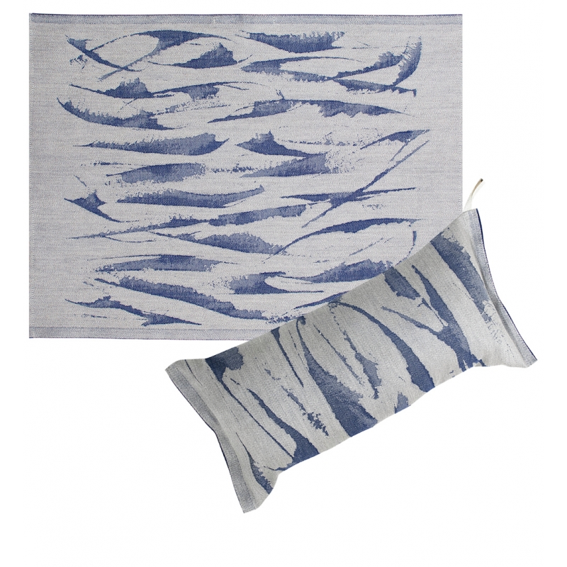 A sauna seat set woven from linen and organic cotton with a Scandinavian Aallokko pattern inspired by the waves of the sea at high tide. By purchasing this set, you also contribute €6.50 to the John Nurminen Clean Baltic Sea Foundation, which aims to keep the Baltic Sea clean for future generations. The set includes a short mat and a pillow.