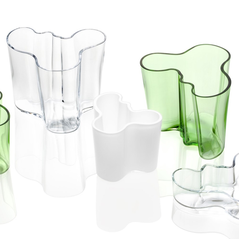 The vase collection is handmade by Finnish glassmakers in original Alvar Aalto molds, with seven craftsmen involved. It takes 30 hours to make one piece, making each product unique.