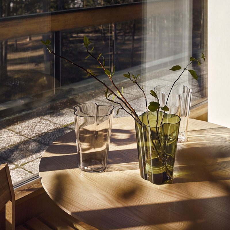 The vase collection is handmade by Finnish glassmakers in original Alvar Aalto molds, with seven craftsmen involved. It takes 30 hours to make one piece, making each product unique.