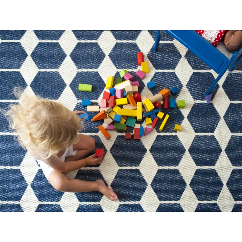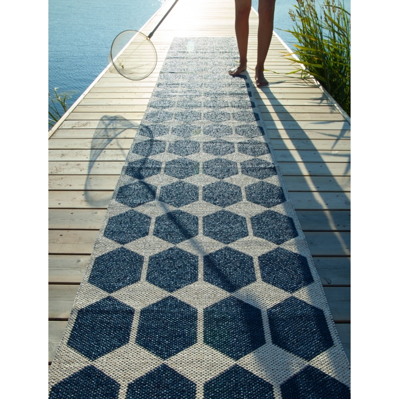 Hand-knitted Anna piece carpet with a regular dark blue pattern. The carpet is also suitable for demanding environments, including outdoor use on a terrace or balcony. It will also work very well in the kitchen or hallway, where classic carpets suffer from moisture and frequent dirt. The vinyl foil is non-slip, durable, washable and suitable for allergy sufferers.