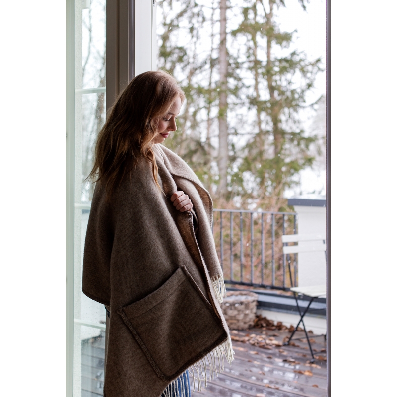 The Arvo wool scarf is woven in Finland from premium Finnish Finnsheep wool combined with certified New Zealand wool. The practical pockets also provide the opportunity to store necessary small items and warm your hands. The brown shade is elegant and the scarf is perfected by fringes.