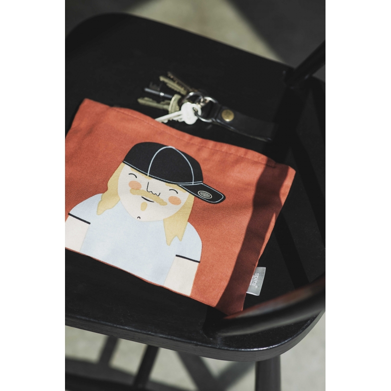 A cotton bag from the Kompisar (Swedish for friends) collection features stylish Axel. Axel is a charming guy who always has a new joke to cheer you up. In his free time, he plays bongos and collects baseball caps. The bag is perfect for traveling to store cosmetics or various small items, it is Hand-printed and zipped.