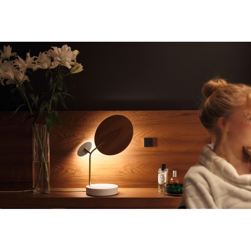 The rotating, adjustable walnut wooden panel together with the solid marble base give the lamp natural elegance and stability, while the frame coated with 24-carat gold brings a subtle touch of prestige and sophisticated luxury to the interior. Thanks to the ability to rotate both LED panels, you can easily create an atmosphere from soft, subdued light to more intense lighting.