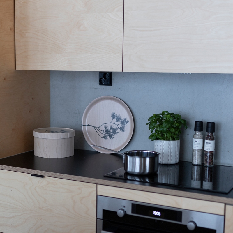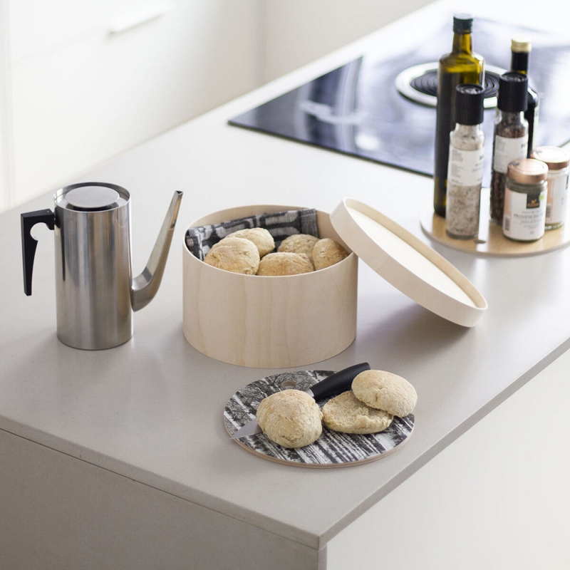 The stylish wooden bread box with a lid is made of high-quality Finnish birch plywood and has an easily removable cutting board on the lid with a beautiful pine branch motif. Thanks to its elegant design, natural materials and excellent functionality, the box will be an indispensable addition to any kitchen. The cutting board is suitable not only for slicing stored bread, but also for preparing and serving your treats.