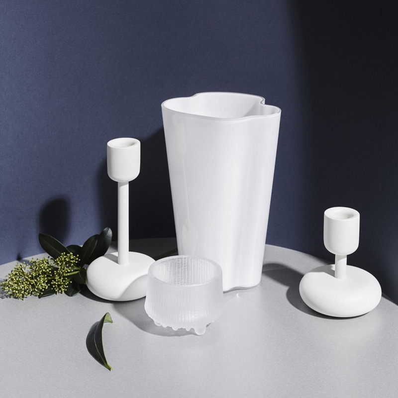 The white candlestick with an unconventional massive base in a timeless Nordic design is made of high-quality steel, which gives it stability even if you put longer candles in it. You can place the Nappula candlestick alone or in a composition in two sizes or in multiple colors.