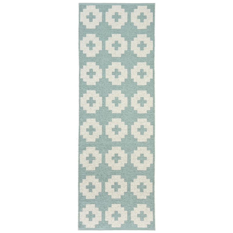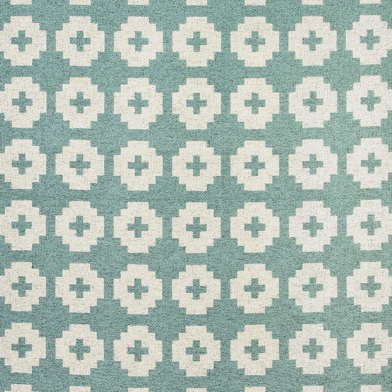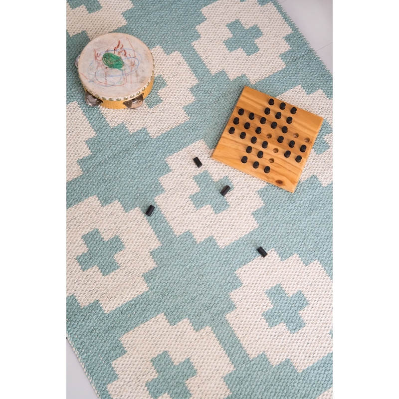 The hand-knitted piece rug Flower in turquoise lagoon is decorated with a geometric Scandinavian pattern. The rug is also suitable for demanding environments, including outdoor use on a terrace or balcony. It will also work very well in the kitchen or hallway, where classic carpets suffer from moisture and frequent dirt. The vinyl foil is non-slip, durable, washable and suitable for allergy sufferers.